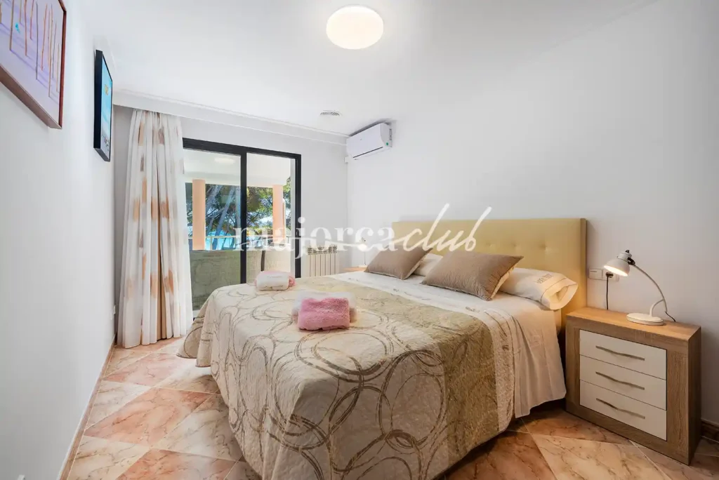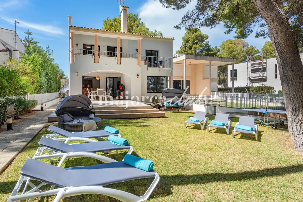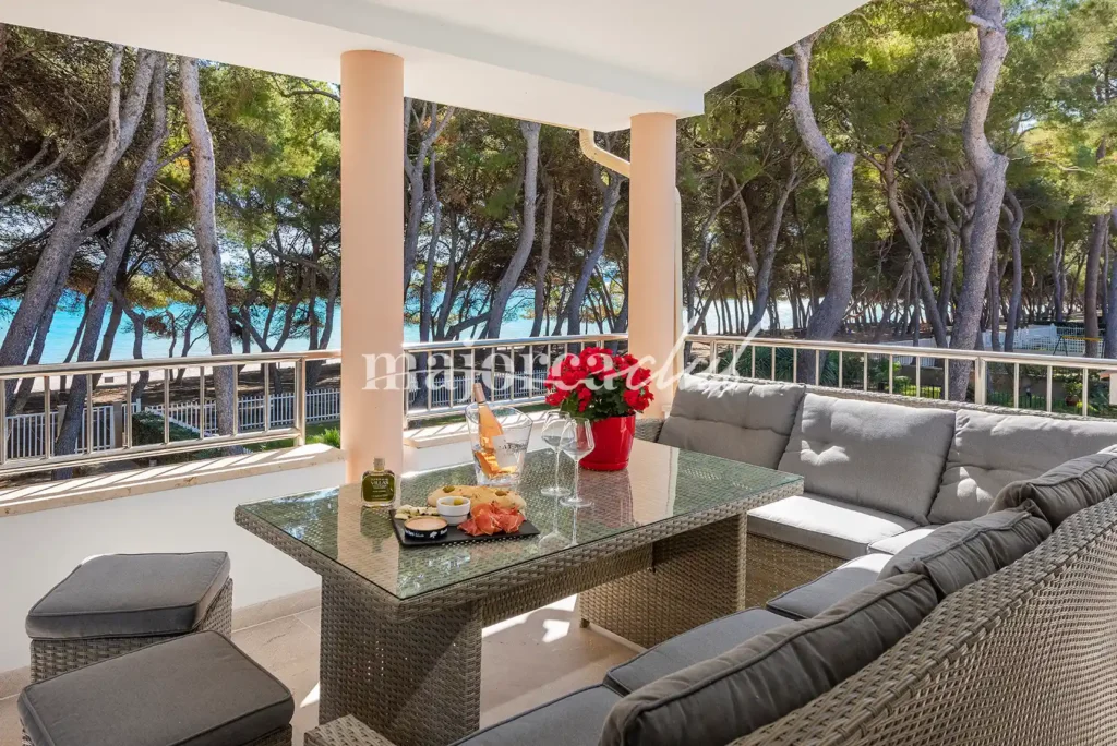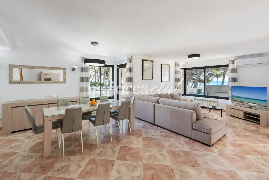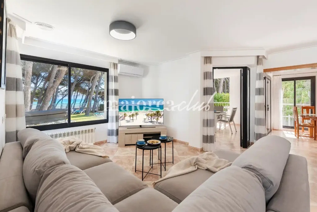 Discover the charm of Villa Voramar, a serene haven right on the edge of Alcúdia's stunning beach. This villa, surrounded by whispering pine trees, offers a picturesque escape with its white sandy beach and turquoise waters just steps away.